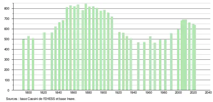 L'évolution du nombre d'habitants est connue à travers les recensements de la population effectués dans la commune depuis 1793. Pour les communes de moins de 10 000 habitants, une enquête de recensement portant sur toute la population est réalisée tous les cinq ans, les populations légales des années intermédiaires étant quant à elles estimées par interpolation ou extrapolation[18]. Pour la commune, le premier recensement exhaustif entrant dans le cadre du nouveau dispositif a été réalisé en 2004[19].