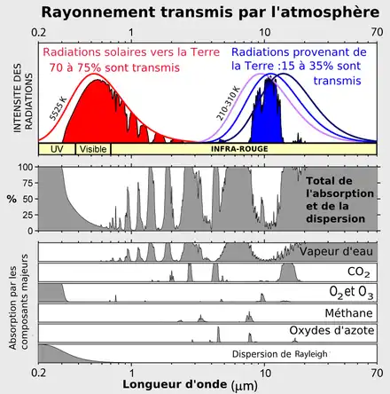 De ce fait le rayonnement qui parvient du Soleil est pondéré par un facteur proportionnel à où est la longueur d'onde : la partie du spectre visible proche du bleu est donc diffusée et observable partout dans le ciel alors que les rouges traversent l'atmosphère quasiment directement[3].