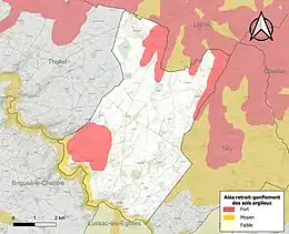 Les mouvements de terrains susceptibles de se produire sur la commune sont des affaissements et effondrements liés aux cavités souterraines (hors mines) et des tassements différentiels[18]. Afin de mieux appréhender le risque d’affaissement de terrain, un inventaire national permet de localiser les éventuelles cavités souterraines sur la commune[19]. Le retrait-gonflement des sols argileux est susceptible d'engendrer des dommages importants aux bâtiments en cas d’alternance de périodes de sécheresse et de pluie[20]. 22,4 % de la superficie communale est en aléa moyen ou fort (79,5 % au niveau départemental et 48,5 % au niveau national)[Carte 2]. Depuis le , en application de la loi ÉLAN, différentes contraintes s'imposent aux vendeurs, maîtres d'ouvrages ou constructeurs de biens situés dans une zone classée en aléa moyen ou fort[Note 2],[21].