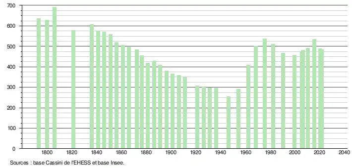 L'évolution du nombre d'habitants est connue à travers les recensements de la population effectués dans la commune depuis 1793. Pour les communes de moins de 10 000 habitants, une enquête de recensement portant sur toute la population est réalisée tous les cinq ans, les populations légales des années intermédiaires étant quant à elles estimées par interpolation ou extrapolation[16]. Pour la commune, le premier recensement exhaustif entrant dans le cadre du nouveau dispositif a été réalisé en 2005[17].