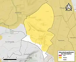Le retrait-gonflement des sols argileux est susceptible d'engendrer des dommages importants aux bâtiments en cas d’alternance de périodes de sécheresse et de pluie. 90,2 % de la superficie communale est en aléa moyen ou fort (67,4 % au niveau départemental et 48,5 % au niveau national). Sur les 74 bâtiments dénombrés sur la commune en 2019, 74 sont en aléa moyen ou fort, soit 100 %, à comparer aux 81 % au niveau départemental et 54 % au niveau national. Une cartographie de l'exposition du territoire national au retrait gonflement des sols argileux est disponible sur le site du BRGM[17],[Carte 3].