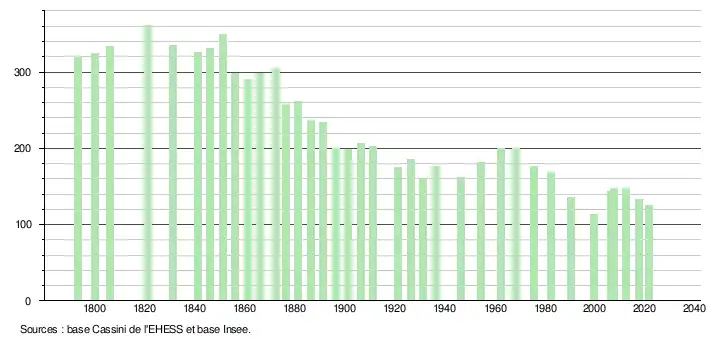 L'évolution du nombre d'habitants est connue à travers les recensements de la population effectués dans la commune depuis 1793. Pour les communes de moins de 10 000 habitants, une enquête de recensement portant sur toute la population est réalisée tous les cinq ans, les populations légales des années intermédiaires étant quant à elles estimées par interpolation ou extrapolation[26]. Pour la commune, le premier recensement exhaustif entrant dans le cadre du nouveau dispositif a été réalisé en 2007[27].