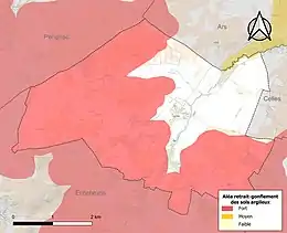 Le retrait-gonflement des sols argileux est susceptible d'engendrer des dommages importants aux bâtiments en cas d’alternance de périodes de sécheresse et de pluie. 70,8 % de la superficie communale est en aléa moyen ou fort (54,2 % au niveau départemental et 48,5 % au niveau national). Sur les 125 bâtiments dénombrés sur la commune en 2019, 76 sont en aléa moyen ou fort, soit 61 %, à comparer aux 57 % au niveau départemental et 54 % au niveau national. Une cartographie de l'exposition du territoire national au retrait gonflement des sols argileux est disponible sur le site du BRGM[11],[Carte 2].