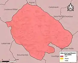 Le retrait-gonflement des sols argileux est susceptible d'engendrer des dommages importants aux bâtiments en cas d’alternance de périodes de sécheresse et de pluie. La totalité de la commune est en aléa moyen ou fort (94,5 % au niveau départemental et 48,5 % au niveau national). Sur les 134 bâtiments dénombrés sur la commune en 2019, 134 sont en aléa moyen ou fort, soit 100 %, à comparer aux 93 % au niveau départemental et 54 % au niveau national. Une cartographie de l'exposition du territoire national au retrait gonflement des sols argileux est disponible sur le site du BRGM[21],[Carte 3].