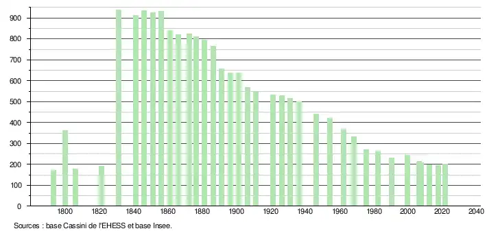 L'évolution du nombre d'habitants est connue à travers les recensements de la population effectués dans la commune depuis 1793. Pour les communes de moins de 10 000 habitants, une enquête de recensement portant sur toute la population est réalisée tous les cinq ans, les populations légales des années intermédiaires étant quant à elles estimées par interpolation ou extrapolation[24]. Pour la commune, le premier recensement exhaustif entrant dans le cadre du nouveau dispositif a été réalisé en 2007[25].