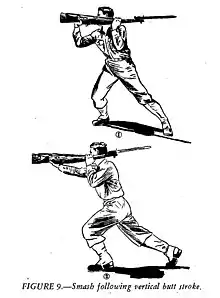 Le coup de crosse comporte le risque d'endommager l'arme et, selon certaines écoles de pensée, est considéré comme une méthode de dernier recours, recommandant l'utilisation d'une baïonnette, si possible, lors d'un combat rapproché[6]. Même si l'on s'appuie principalement sur la baïonnette, un coup de crosse peut toujours s'avérer efficace comme mouvement de transition après une charge à la baïonnette ratée, en amenant la crosse de l'arme dans un mouvement vertical vers le haut dans l'aine du combattant[6].