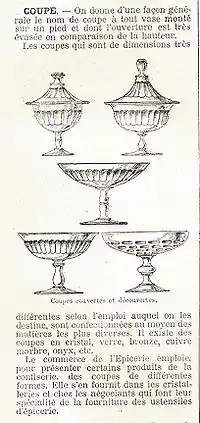 Une coupe, généralement sans pied, de taille variable, peut aussi servir à recevoir différents aliments, notamment des fruits, la glace (coupe glacée)...