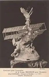 Paul Roussel, Triomphe de l'Aviation (1909). Le trophée tel qu'il fut initialement prévu. Après la victoire de Wright, l'aéronef — un Farman — sera remplacé par une chauve-souris.