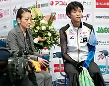 Le médaillé d'or Yuzuru Hanyu dans le kiss and cry avec son entraîneur Nanami Abe