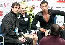 Les médaillés d'or Aljona Savchenko et Robin Szolkowy dans le kiss and cry avec leur entraîneur Ingo Steuer