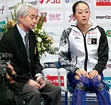 La médaillée d'or Mao Asada dans le kiss and cry avec son entraîneur Nobuo Satō