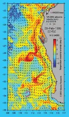 - La température de surface provient notamment du satellite américain NOAA 14, tandis que la vitesse du courant en surface est déduite de la mesure du niveau de la mer, que réalisent le satellite franco-américain TOPEX/Poseidon et le satellite européen ERS