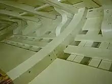 - courbes d'écusson ou de contre-lisse — placées dans la cale sur les façons de l'arrière ; leur branche inférieure est liée obliquement sur plusieurs membres, et la supérieure arc-boute contre l'arcasse, au-dessous de la barre du premier pont;