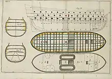 Nicolas Aubin. Dictionnaire de marine[6]. Gabarit d'un vaisseau vers 1700 (Première figure). Les courbes et aiguillettes sont exagérées par souci didactique. Légende: a – courbe de premier pont; b – courbaton du haut pont; c – serre-gouttière; d – dalot; e – faix de pont; f – bordage qui couvrent le pont; g – travertin de l'affut; h – bau; k – roue de l'affut; l – allonges; m – genou de fond