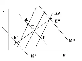 Dans le cas d’une imparfaite mobilité des capitaux, la courbe BP a une allure croissante. Pour expliquer la raison de cette allure, il est possible de faire référence au graphique latéral. Quand le revenu augmente (toutes choses égales par ailleurs), l’équilibre se déplace du point E au point P ; la balance des paiements est devenue déficitaire car les importations ont augmenté. En plus, dans le point P, elles ne sont compensées par une entrée suffisante de capitaux car le taux d'intérêt n'a, lui, pas augmenté[3].