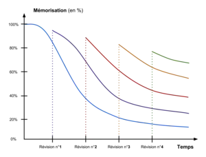 La prémisse dans la pensée d'Ebbinghaus fut que chaque répétition dans l'apprentissage augmente l’intervalle optimum entre deux répétitions. Pour une rétention quasi parfaite des connaissances, les répétitions initiales doivent se faire à quelques jours d'intervalle tandis que plus l'apprenant exerce de répétitions, plus il pourra les espacer, jusqu'à terme, avoir un intervalle d'une ou plusieurs années. La recherche énonça par la suite (et en dehors des deux facteurs de Ebbinghaus) que plus l'apprentissage originel des connaissances est efficace et plus cela ralentit le processus d'oubli[4].