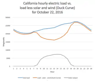 La courbe de[1], du[2] ou en[3] canard, également appelée le dos de canard (duck curve), est un graphique de la production d'électricité au cours d'une journée qui montre le déséquilibre temporel entre la demande de pointe et la production d'énergie solaire. Utilisée dans la production d'électricité à grande échelle, le terme a été inventé en 2012 par le California Independent System Operator (en)[4],[5].