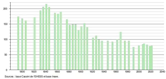 L'évolution du nombre d'habitants est connue à travers les recensements de la population effectués dans la commune depuis 1793. Pour les communes de moins de 10 000 habitants, une enquête de recensement portant sur toute la population est réalisée tous les cinq ans, les populations légales des années intermédiaires étant quant à elles estimées par interpolation ou extrapolation[15]. Pour la commune, le premier recensement exhaustif entrant dans le cadre du nouveau dispositif a été réalisé en 2008[16].