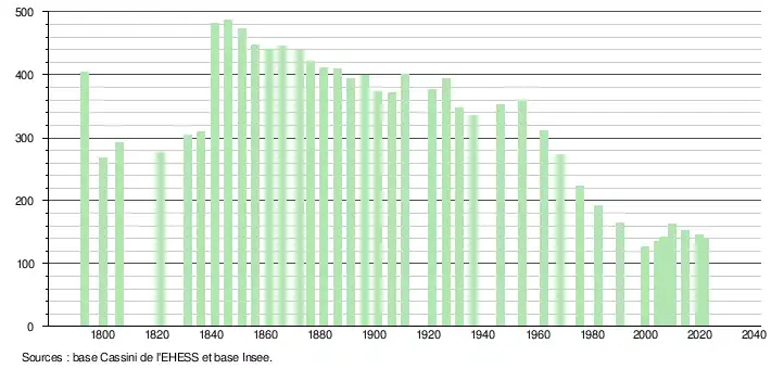 L'évolution du nombre d'habitants est connue à travers les recensements de la population effectués dans la commune depuis 1793. Pour les communes de moins de 10 000 habitants, une enquête de recensement portant sur toute la population est réalisée tous les cinq ans, les populations légales des années intermédiaires étant quant à elles estimées par interpolation ou extrapolation[25]. Pour la commune, le premier recensement exhaustif entrant dans le cadre du nouveau dispositif a été réalisé en 2004[26].