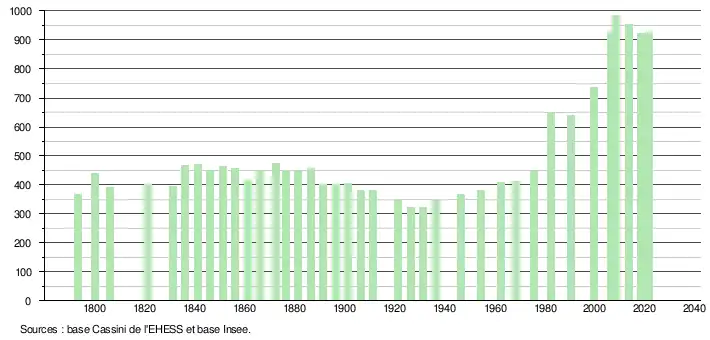 L'évolution du nombre d'habitants est connue à travers les recensements de la population effectués dans la commune depuis 1793. Pour les communes de moins de 10 000 habitants, une enquête de recensement portant sur toute la population est réalisée tous les cinq ans, les populations légales des années intermédiaires étant quant à elles estimées par interpolation ou extrapolation[17]. Pour la commune, le premier recensement exhaustif entrant dans le cadre du nouveau dispositif a été réalisé en 2008[18].
