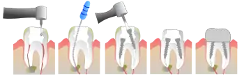 - préparation de la dent : la dent étant dévitalisée, il est nécessaire d'utiliser un ancrage radiculaire : inlay-core ou faux-moignon qui est un tenon placé dans la racine. Le dentiste réalise donc une préparation interne et externe de la dent à couronner. La préparation interne nécessite de creuser dans le matériau d'obturation de la racine (gutta-percha le plus souvent), le tenon doit être long des 2/3 à la moitié de la racine pour assurer la rétention. L'intérieur de la dent doit être de dépouille. La préparation externe dépend du type de couronne : pour une couronne métal, on doit avoir 0,5 mm d'épaisseur au minimum ; pour une couronne céramo-métallique, on aura 1,5 mm d'épaisseur ;