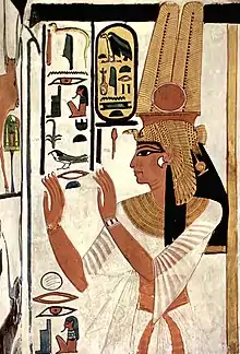 Néfertari, épouse de Ramsès II, portant une couronne de vautour, des plumes et un disque solaire