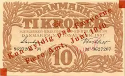 Lorsque les troupes du Troisième Reich occupent le Danemark le , la couronne danoise est utilisée dans les îles Féroé. Au même moment, le Royaume-Uni prend le contrôle de l'archipel ; l'occupation britannique des îles Féroé commence. Tous les échanges entre le Danemark et les îles Féroé sont alors interrompus, et dès le , les autorités féroïennes mettent en circulation de nouveaux billets de banque : des billets danois avec une surcharge à l'encre rouge, qui remplacent les billets danois de même valeur[3]. De nouveaux billets sont imprimés à partir du , « au nom de la Banque nationale du Danemark[4] ».