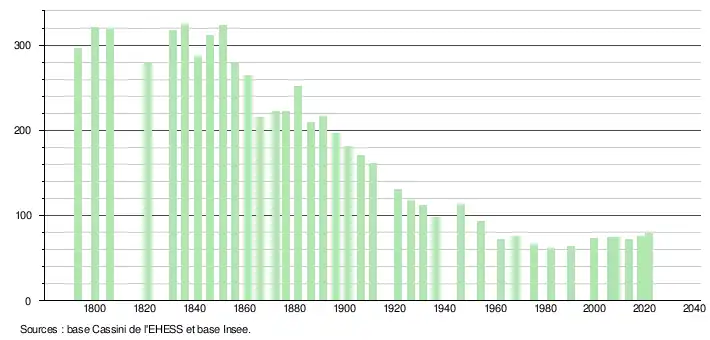 L'évolution du nombre d'habitants est connue à travers les recensements de la population effectués dans la commune depuis 1793. Pour les communes de moins de 10 000 habitants, une enquête de recensement portant sur toute la population est réalisée tous les cinq ans, les populations légales des années intermédiaires étant quant à elles estimées par interpolation ou extrapolation[25]. Pour la commune, le premier recensement exhaustif entrant dans le cadre du nouveau dispositif a été réalisé en 2008[26].