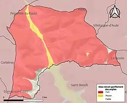 Le retrait-gonflement des sols argileux est susceptible d'engendrer des dommages importants aux bâtiments en cas d’alternance de périodes de sécheresse et de pluie. 96 % de la superficie communale est en aléa moyen ou fort (75,2 % au niveau départemental et 48,5 % au niveau national). Sur les 64 bâtiments dénombrés sur la commune en 2019, 64 sont en aléa moyen ou fort, soit 100 %, à comparer aux 94 % au niveau départemental et 54 % au niveau national. Une cartographie de l'exposition du territoire national au retrait gonflement des sols argileux est disponible sur le site du BRGM[19],[Carte 3].
