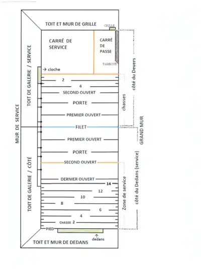 - À la différence de celui du tennis, le terrain de paume n’est pas symétrique et se divise en 2 parties, le dedans (côté depuis lequel se fait le service) et le devers (côté réception).