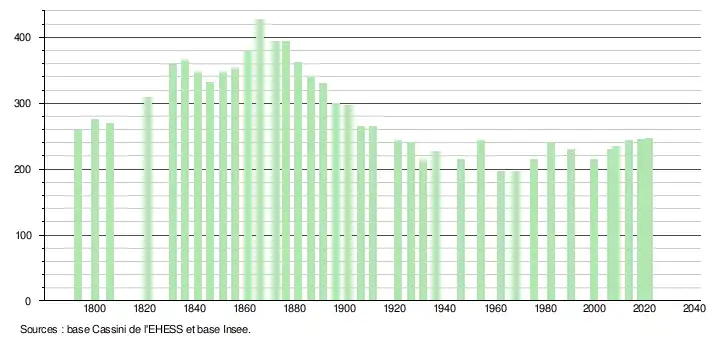 L'évolution du nombre d'habitants est connue à travers les recensements de la population effectués dans la commune depuis 1793. Pour les communes de moins de 10 000 habitants, une enquête de recensement portant sur toute la population est réalisée tous les cinq ans, les populations légales des années intermédiaires étant quant à elles estimées par interpolation ou extrapolation[17]. Pour la commune, le premier recensement exhaustif entrant dans le cadre du nouveau dispositif a été réalisé en 2008[18].