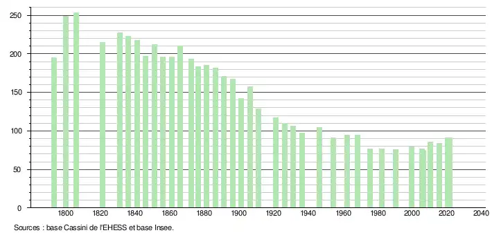 L'évolution du nombre d'habitants est connue à travers les recensements de la population effectués dans la commune depuis 1793. Pour les communes de moins de 10 000 habitants, une enquête de recensement portant sur toute la population est réalisée tous les cinq ans, les populations légales des années intermédiaires étant quant à elles estimées par interpolation ou extrapolation[16]. Pour la commune, le premier recensement exhaustif entrant dans le cadre du nouveau dispositif a été réalisé en 2005[17].