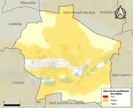 Le retrait-gonflement des sols argileux est susceptible d'engendrer des dommages importants aux bâtiments en cas d’alternance de périodes de sécheresse et de pluie. 65,6 % de la superficie communale est en aléa moyen ou fort (52,8 % au niveau départemental et 48,5 % au niveau national). Sur les 1 102 bâtiments dénombrés sur la commune en 2019, 525 sont en aléa moyen ou fort, soit 48 %, à comparer aux 70 % au niveau départemental et 54 % au niveau national. Une cartographie de l'exposition du territoire national au retrait gonflement des sols argileux est disponible sur le site du BRGM[20],[Carte 2].