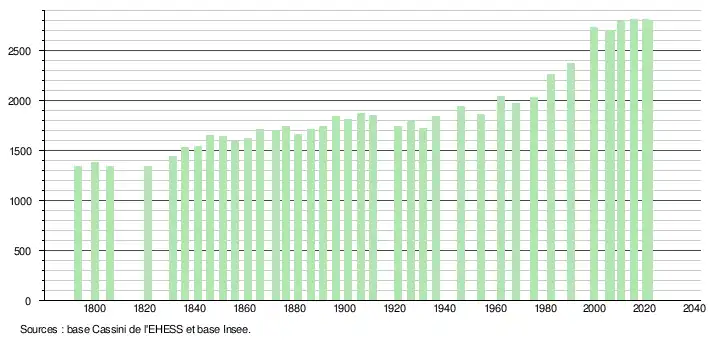 L'évolution du nombre d'habitants est connue à travers les recensements de la population effectués dans la commune depuis 1793. Pour les communes de moins de 10 000 habitants, une enquête de recensement portant sur toute la population est réalisée tous les cinq ans, les populations légales des années intermédiaires étant quant à elles estimées par interpolation ou extrapolation[37]. Pour la commune, le premier recensement exhaustif entrant dans le cadre du nouveau dispositif a été réalisé en 2005[38].