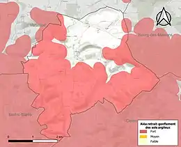 Les mouvements de terrains susceptibles de se produire sur la commune sont des tassements différentiels[36]. Le retrait-gonflement des sols argileux est susceptible d'engendrer des dommages importants aux bâtiments en cas d’alternance de périodes de sécheresse et de pluie[37]. 71,4 % de la superficie communale est en aléa moyen ou fort (58,6 % au niveau départemental et 48,5 % au niveau national métropolitain)[Carte 4]. Depuis le , en application de la loi ÉLAN, différentes contraintes s'imposent aux vendeurs, maîtres d'ouvrages ou constructeurs de biens situés dans une zone classée en aléa moyen ou fort[Note 5],[38].
