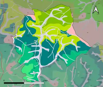 L'occupation des sols de la commune, telle qu'elle ressort de la base de données européenne d’occupation biophysique des sols Corine Land Cover (CLC), est marquée par l'importance des territoires agricoles (83,5 % en 2018), une proportion identique à celle de 1990 (83,6 %). La répartition détaillée en 2018 est la suivante : terres arables (65,3 %), forêts (16,5 %), zones agricoles hétérogènes (13,9 %), prairies (4,3 %)[30]. L'évolution de l’occupation des sols de la commune et de ses infrastructures peut être observée sur les différentes représentations cartographiques du territoire : la carte de Cassini (XVIIIe siècle), la carte d'état-major (1820-1866) et les cartes ou photos aériennes de l'IGN pour la période actuelle (1950 à aujourd'hui)[Carte 3].