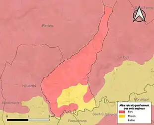 Le retrait-gonflement des sols argileux est susceptible d'engendrer des dommages importants aux bâtiments en cas d’alternance de périodes de sécheresse et de pluie. La totalité de la commune est en aléa moyen ou fort (67,4 % au niveau départemental et 48,5 % au niveau national). Sur les 47 bâtiments dénombrés sur la commune en 2019, 47 sont en aléa moyen ou fort, soit 100 %, à comparer aux 84 % au niveau départemental et 54 % au niveau national. Une cartographie de l'exposition du territoire national au retrait gonflement des sols argileux est disponible sur le site du BRGM[19],[Carte 2].