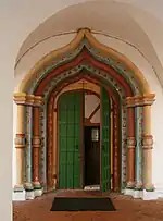 Les Saintes-Portes de l'église de l'Annonciation sont également un édifice ancien dans l'enceinte du couvent. Elles ont été construites en 1515. Une double fonction leur est attribuée : à la fois constituer une puissante tour de défense et en même temps une église. Les trois coupoles de l'église sont placées sur le toit d'un quadrilatère massif, coupé par deux ouvertures cintrées au centre qui permettent le passage et lui donnent un peu l'aspect de la cathédrale de l'Intercession. Deux petites chapelles aux angles de l'église sont couronnées de tambours couverts de dômes en forme de casque. Le tambour central, avec ses fenêtres étroites s'appuie sur deux niveaux de zakomars en forme de quilles renversées. Les façades de la tour rectangulaire sont richement ornées d'un décor complexe de frises qui rappellent la sculpture en bois. Comme la cathédrale de l'Intercession, l'église des Saintes-Portes a été reconstruite plusieurs fois. La restauration de 1958 sur base des plans d'Alexis Varganov a permis de reconstituer son aspect initial.