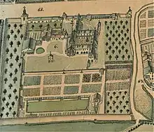 1750 : quatrième représentation connue du couvent et probablement la plus précise sous l'Ancien Régime, au temps des bénédictines et avant l'incendie de 1756 (extrait du "Plan de Joinville" dit de Contenot ; Hôtel de Ville de Joinville)
