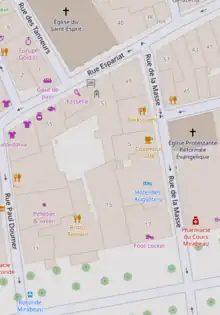 De droite à gauche : tour de la chapelle, immeuble d'habitation (copropriété) et magasin derrière l'ancien portail de l'église du couvent.