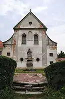 Le couvent, entouré de murs, est orienté est-ouest avec l'entrée principale de l'église à l'ouest. Celle-ci présente en façade un vaste fronton triangulaire sans clocher qui donne sur un parvis avec une statue baroque de l'Immaculée Conception de style autrichien. L'extérieur comme l'intérieur de l'église sont ornés de niches et de pilastres. Le maître-autel baroque est richement décoré.