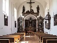 L'église, consacrée en 1602, est placée sous le vocable de saint François d'Assise et de saint Bonaventure. On remarque dix bas-reliefs à l'intérieur remontant à 1490. Ils décorent l'entourage de la porte de chêne et se trouvaient dans l'ancienne cathédrale romane de Salzbourg. Le plus célèbre représente saint François d'Assise recevant les stigmates.