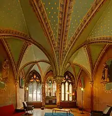 Du côté sud, contre l’église, l’aile orientale est occupée au rez-de-chaussée par l’ancienne sacristie, devenue ultérieurement chapelle de l’hôpital. Celle-ci est une salle quadrangulaire voûtée d’ogive comptant deux vaisseaux de deux travées. Les voûtes retombent sur une pile centrale fasciculée et leurs clefs portent les armoiries des abbaye de Murbach et de Lure. Le côté nord de l’aile orientale est occupé par la salle capitulaire. Celle-ci a été transformée au XIXe siècle en chapelle et dotée alors d’une fausse voûte à clef centrale pendante[13].