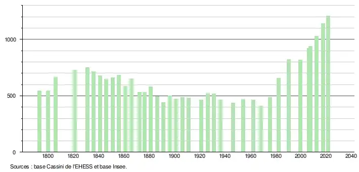 L'évolution du nombre d'habitants est connue à travers les recensements de la population effectués dans la commune depuis 1793. Pour les communes de moins de 10 000 habitants, une enquête de recensement portant sur toute la population est réalisée tous les cinq ans, les populations légales des années intermédiaires étant quant à elles estimées par interpolation ou extrapolation[28]. Pour la commune, le premier recensement exhaustif entrant dans le cadre du nouveau dispositif a été réalisé en 2007[29].