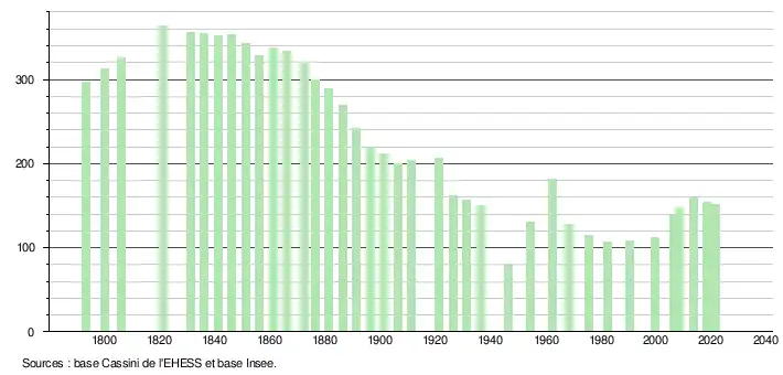 L'évolution du nombre d'habitants est connue à travers les recensements de la population effectués dans la commune depuis 1793. Pour les communes de moins de 10 000 habitants, une enquête de recensement portant sur toute la population est réalisée tous les cinq ans, les populations légales des années intermédiaires étant quant à elles estimées par interpolation ou extrapolation[15]. Pour la commune, le premier recensement exhaustif entrant dans le cadre du nouveau dispositif a été réalisé en 2008[16].