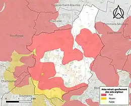 Le retrait-gonflement des sols argileux est susceptible d'engendrer des dommages importants aux bâtiments en cas d’alternance de périodes de sécheresse et de pluie. 62,8 % de la superficie communale est en aléa moyen ou fort (54,2 % au niveau départemental et 48,5 % au niveau national). Sur les 261 bâtiments dénombrés sur la commune en 2019, 108 sont en aléa moyen ou fort, soit 41 %, à comparer aux 57 % au niveau départemental et 54 % au niveau national. Une cartographie de l'exposition du territoire national au retrait gonflement des sols argileux est disponible sur le site du BRGM[16],[Carte 2].