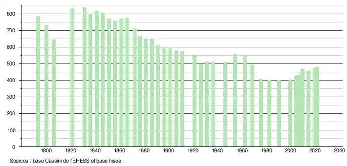 L'évolution du nombre d'habitants est connue à travers les recensements de la population effectués dans la commune depuis 1793. Pour les communes de moins de 10 000 habitants, une enquête de recensement portant sur toute la population est réalisée tous les cinq ans, les populations légales des années intermédiaires étant quant à elles estimées par interpolation ou extrapolation[19]. Pour la commune, le premier recensement exhaustif entrant dans le cadre du nouveau dispositif a été réalisé en 2004[20].