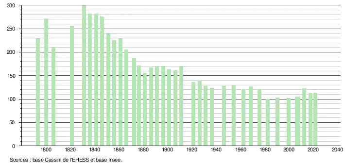 L'évolution du nombre d'habitants est connue à travers les recensements de la population effectués dans la commune depuis 1793. Pour les communes de moins de 10 000 habitants, une enquête de recensement portant sur toute la population est réalisée tous les cinq ans, les populations légales des années intermédiaires étant quant à elles estimées par interpolation ou extrapolation[27]. Pour la commune, le premier recensement exhaustif entrant dans le cadre du nouveau dispositif a été réalisé en 2007[28].