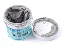 - la facilité de dépose sur les cartes électroniques (produit d'apport de brasage déjà sous forme fluide et donc applicable par exemple au moyen d'un pochoir).