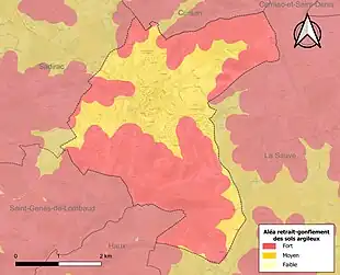 Le retrait-gonflement des sols argileux est susceptible d'engendrer des dommages importants aux bâtiments en cas d’alternance de périodes de sécheresse et de pluie. La totalité de la commune est en aléa moyen ou fort (67,4 % au niveau départemental et 48,5 % au niveau national). Sur les 1 857 bâtiments dénombrés sur la commune en 2019, 1 857 sont en aléa moyen ou fort, soit 100 %, à comparer aux 84 % au niveau départemental et 54 % au niveau national. Une cartographie de l'exposition du territoire national au retrait gonflement des sols argileux est disponible sur le site du BRGM[21],[Carte 2].